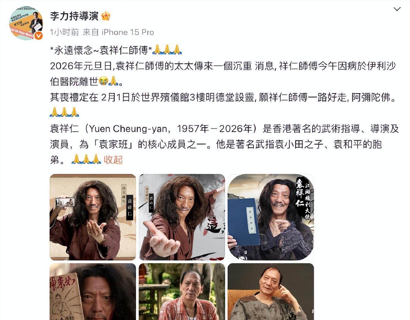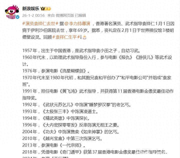 2026年元旦,一则消息让影迷心头一紧:香港著名演员、武术指导袁祥仁因病于伊利沙伯医院去世,享年69岁。其丧礼定于2月1日在世界殡仪馆设灵。这位在台前幕后都留下浓墨重彩一笔的“黄金配角”的离去,瞬间点燃了网络时代的集体记忆。